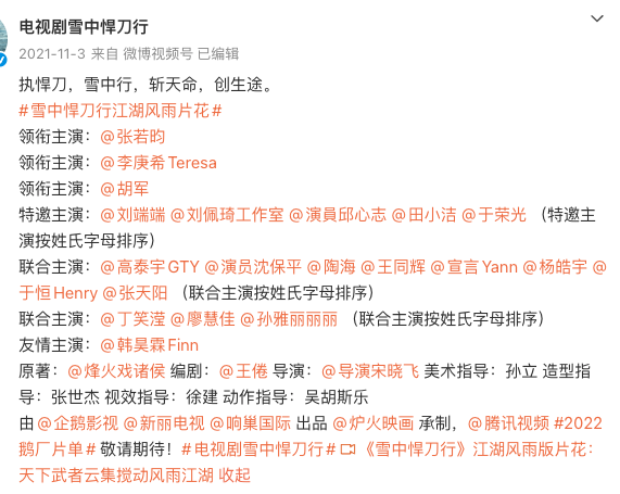 其实,早在2021年《雪中悍刀行》官宣时,就已经有了领衔、特邀、联合、友情主演,可谓人均主演。