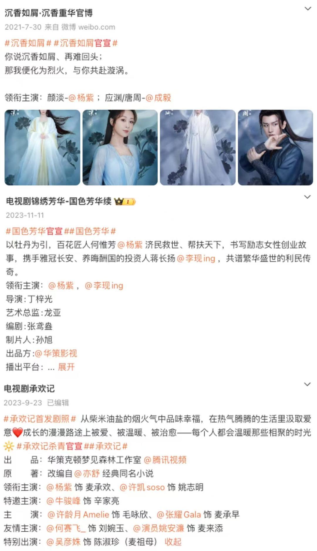 譬如杨紫领衔主演的三部剧,《沉香如屑》官宣时,她的名字在前,尔后用分号隔开二番成毅;《国色芳华》则是在杨紫之后,用逗号隔开二番李现;《承欢记》干脆改用顿号隔开二番许凯。